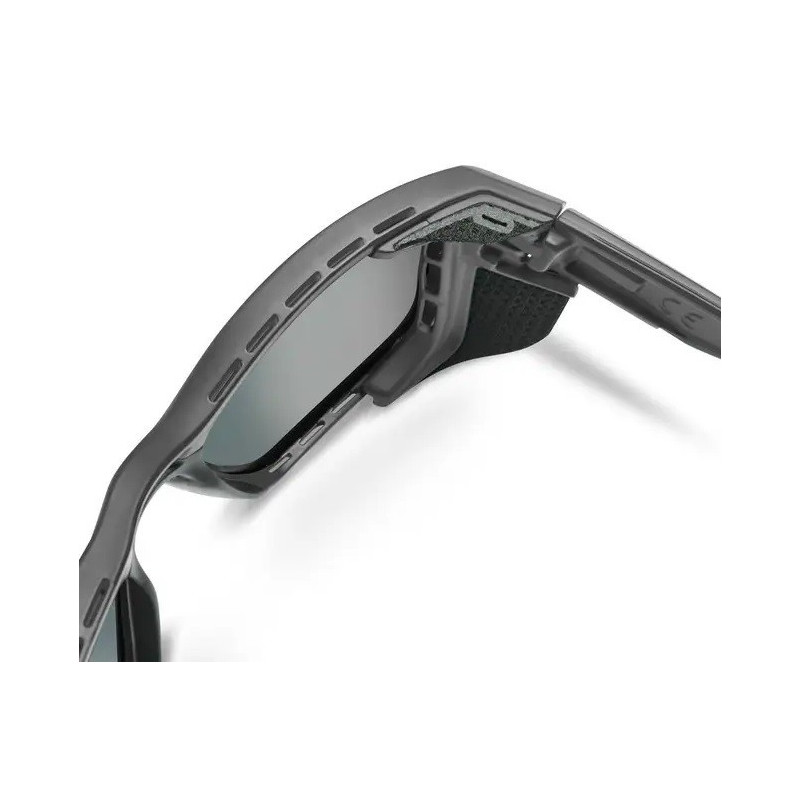 Cat. 4 polycarbonate lens (visible light transmission rate: 5%) with an anti-reflective coating: improves visual comfort by eliminating stray reflections. And a flash finish: improves filtration of visible light by applying a mirror effect to the lens. Blocks sunlight and increases the filter effect. Recommended for sports exposed to conditions with strong glare.