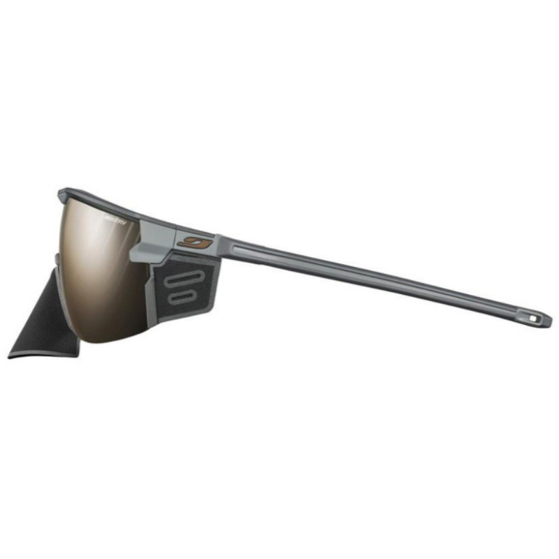 Julbo reinvents mountain goggles with ULTIMATE COVER, combining high protection and ultra lightness. This model provides optimum protection for the eyes and face thanks to a nose guard and removable Spandex side shields that comfortably protect against sun, wind and cold. Its modular design can accompany the mountaineer from training in the valley to reaching the highest peaks. CustomFIT temples with precise and long-lasting adjustment, combined with a Grip Tech structure, produce a tailor-made grip and a lightweight spec. Fitted with a 3D Nose, the glasses offer flawless hold when you're working flat out, with or without a helmet. A panoramic lens creates an energetic style while giving you protection and visual comfort thanks to REACTIV Photochromic lenses. ULTIMATE COVER will help push your limits all the way to the top!